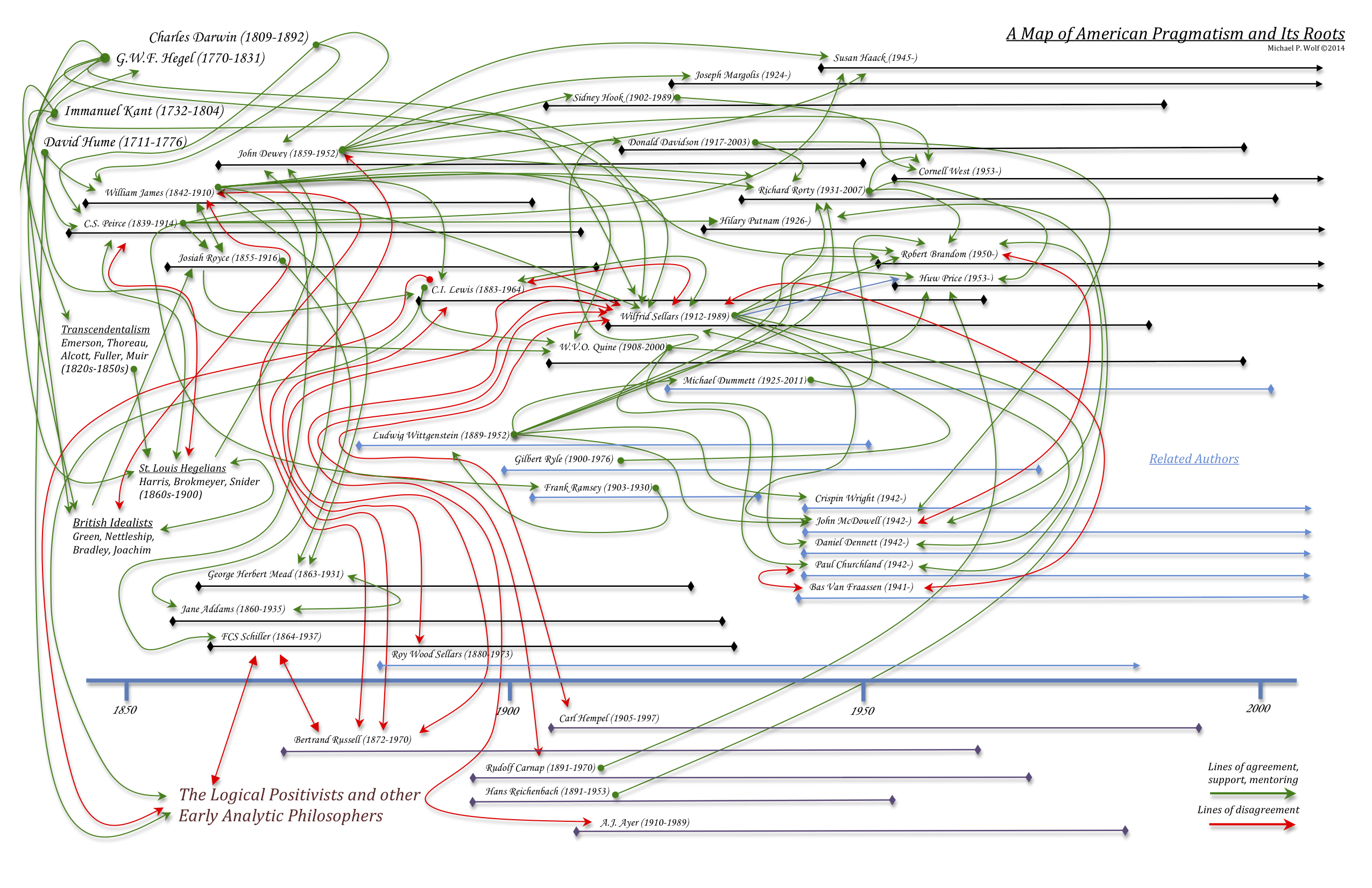 Below is a map of authors in the pragmatist tradition, with a lot of major authors, scientists and activists. The intent here was initially to create something that my student might use as a resource to think about how some big debates unfolded. Where one person contributed favorably to another’s work, a green line connects them. Where one author tended to clash with another, a red line connects them. The connections there are about the predominance of support/agreement or disagreement between the authors. If we were being totally honest, every author should be connected to every other by a variegated braid with more colors than your monitor would support, of course. This simply suggests predominant patterns on stuff for which we would remember their work.